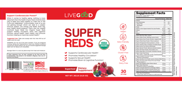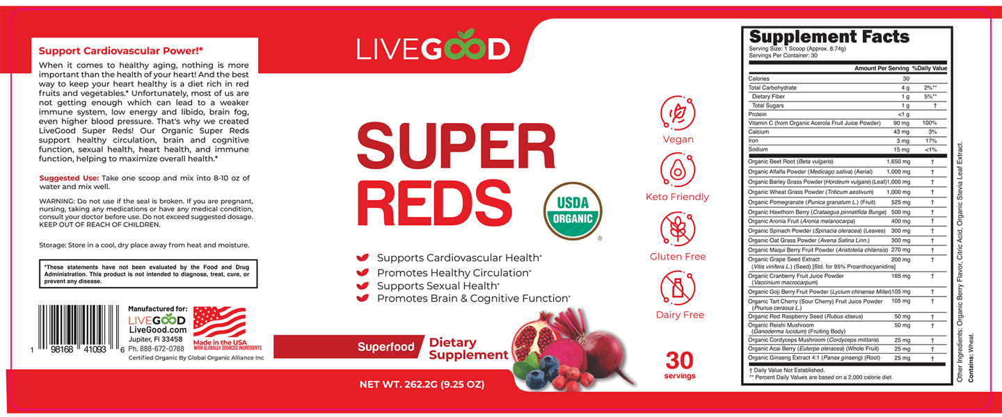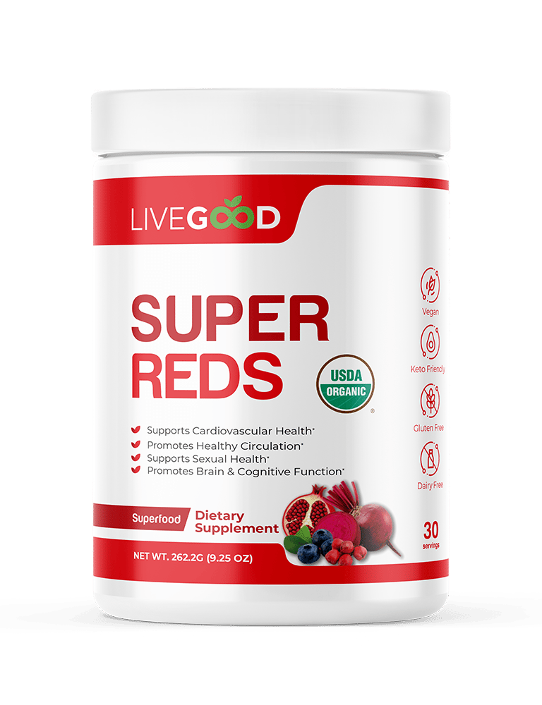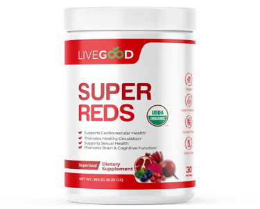 That's why we created LiveGood Super Reds! Our Organic Super Reds contain the highest amount of fruit and vegetable extracts known to help improve blood flow by increasing our body's production of Nitric Oxide, boosting blood circulation, supporting brain and cognitive function, sexual health, heart health, immune function and helping to maximize your body's overall health!